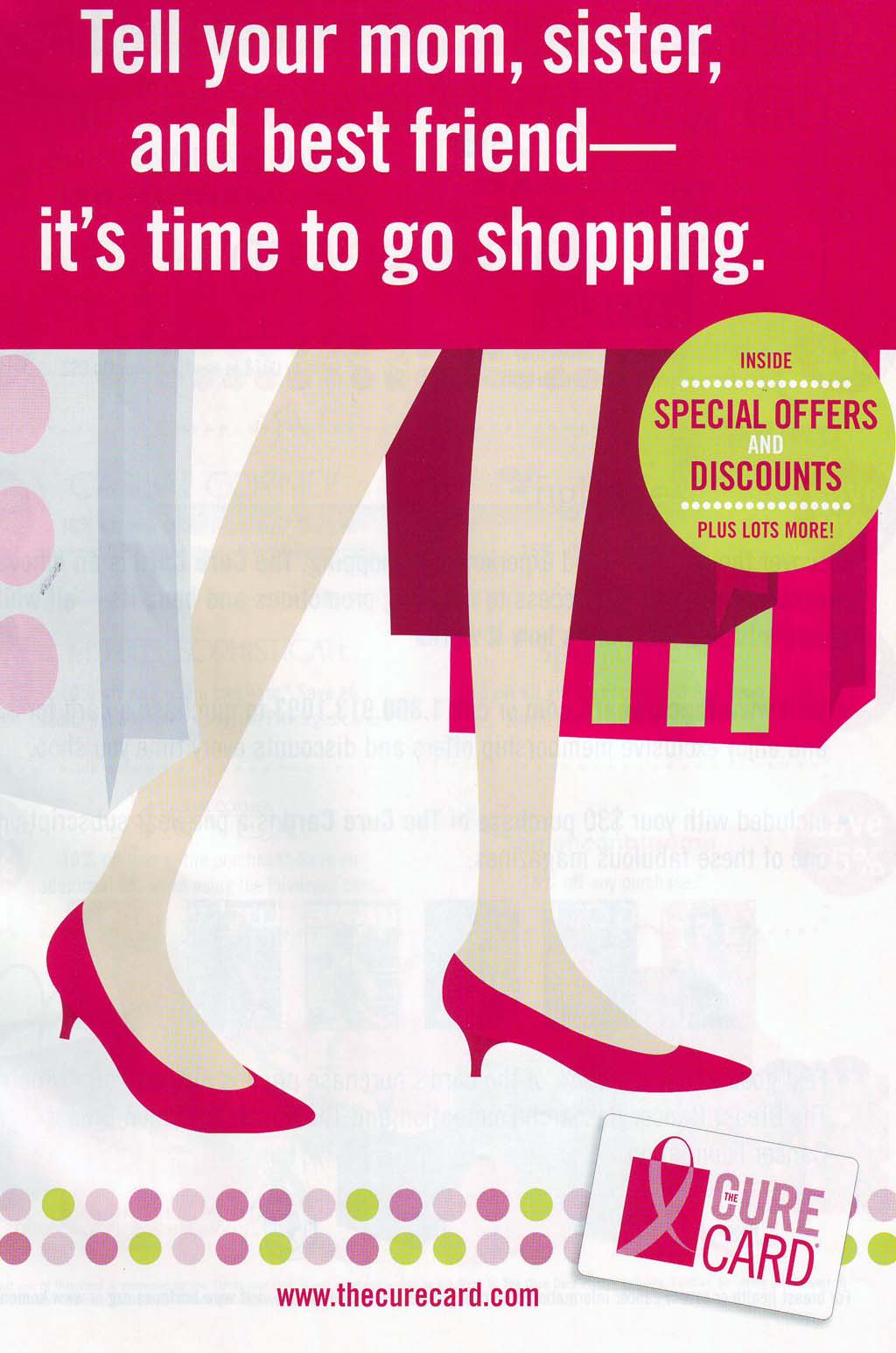 es a love of feminine accoutrements—jewelry, clothing, cosmetics, perfumes, shoes, and accessories ad infinitum… all with a pink ribbon on top. Especially with the rise of cause marketing, pink ribbon culture sells a pink lifestyle. Women supporters of the cause should pamper themselves with pink products. A fashionable person can shop for the cure, laugh for the cure, drink wine for the cure, buy shoes for the cure, listen to music for the cure, get a massage for the cure, spend a weekend in a fancy hotel for the cure, test-drive a BMW for the cure, or use their pink tech for the cure. A four-page ad in Self magazine for the “Cure Card” reads: “Tell your mom, sister, and best friend—it’s time to go shopping…Get special offers, discounts, and more from your favorite retailers and brands… Discounts Galore…So go ahead … Treat Yourself to the Cure Card.” Pink ribbon culture encourages women consumers to treat themselves to the vast selection of pink products and feel-good activities in support of the cause.