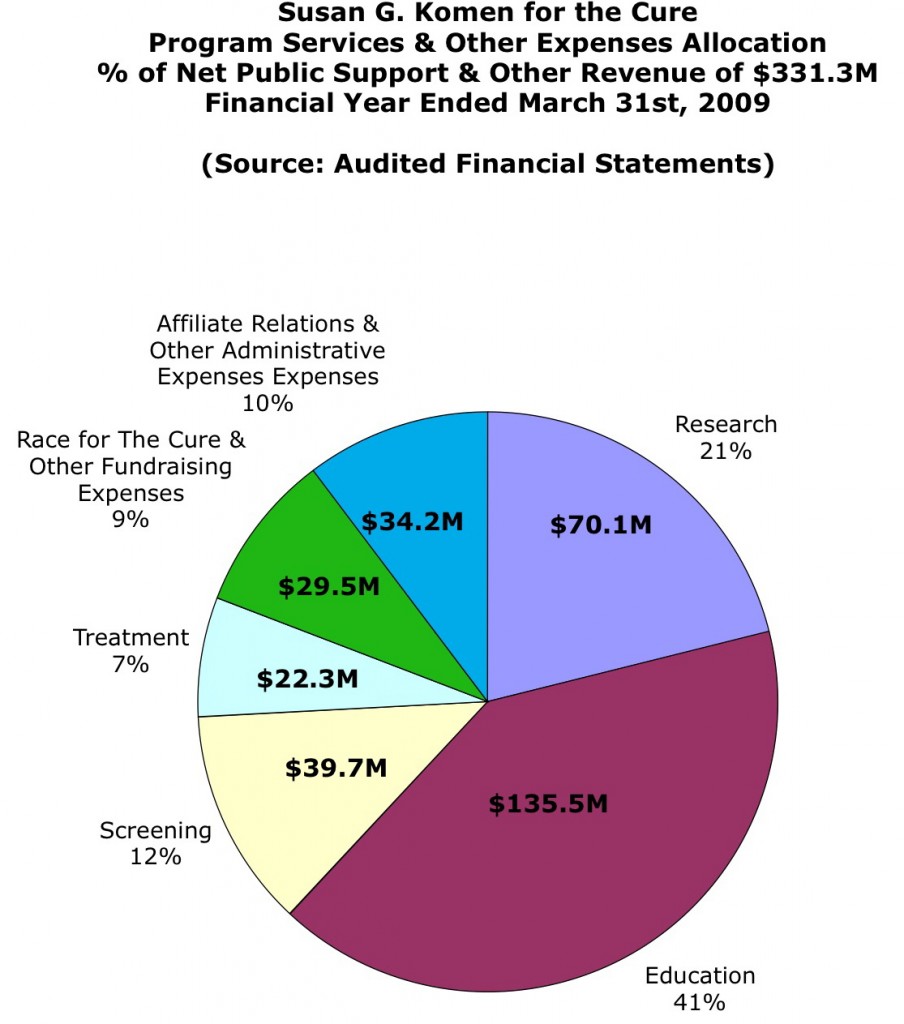 The Education program received the highest allocation of $135.5 million, or 41% of total Net Public Support and Other Revenue; in fact, its highest annual percentage allocation for the six-year period from 2004 to 2009. The Research program received only $70.1 million, or 21% of total Net Public Support and Other Revenue; indeed its lowest annual percentage allocation for the six-year period from 2004 to 2009. (For further information on how Komen’s program spending has changed over time, please refer to “Komen By The Numbers: The Context of Research”).