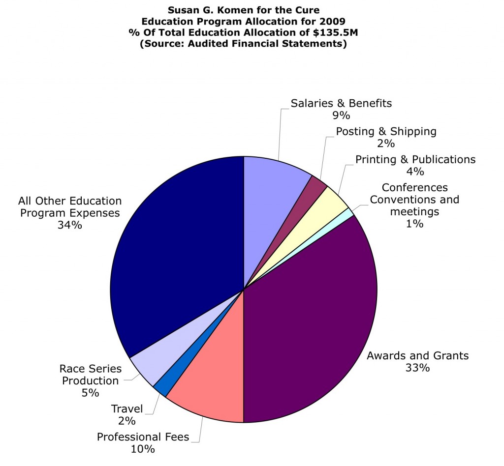 In reading the tables below and summarized in the following chart, consider the following example. In 2009, from an Education program allocation of $135.5 million, Komen made actual education awards and grants of $46.7 million or 34% of the total Education allocation. Other notable expenses included $11.6 million on Salaries; $13.6 million on Professional fees (generally includes legal and accounting fees); $6.1 million on Production expenses for Race for The Cure; $4.9 million on Printing and Publications; $2.9M on Postage and Shipping; $2.5M om Travel; $1.5M on Conferences and remaining operating expenses totaling $45.4M million. To summarize, actual Education grants accounted for 34% of the Education allocation of $135.5 million. Education program operating expenses accounted for 66% of the Education allocation of $135.5 million.