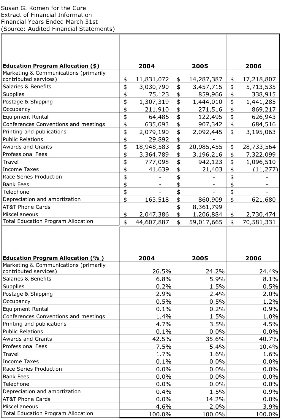 After reviewing Komen’s audited financial statements, and the Education program allocations for each of the six years from 2004-2009, I produced table summaries (attached at the bottom of this post), which show how Komen spent each year’s Education program allocation.