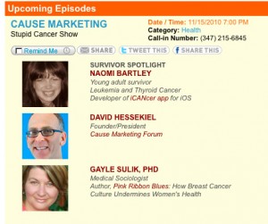 Tune in on Monday, November 15 at 8:00 PM Eastern Standard Time for an interesting episode of The Stupid Cancer Show – focusing on cause marketing.